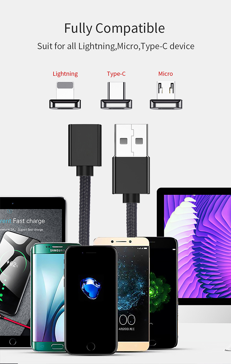 High quality 3A fast charge 3 in 1 magnetic usb data cable Color: Black/Red/Pink/Silver/